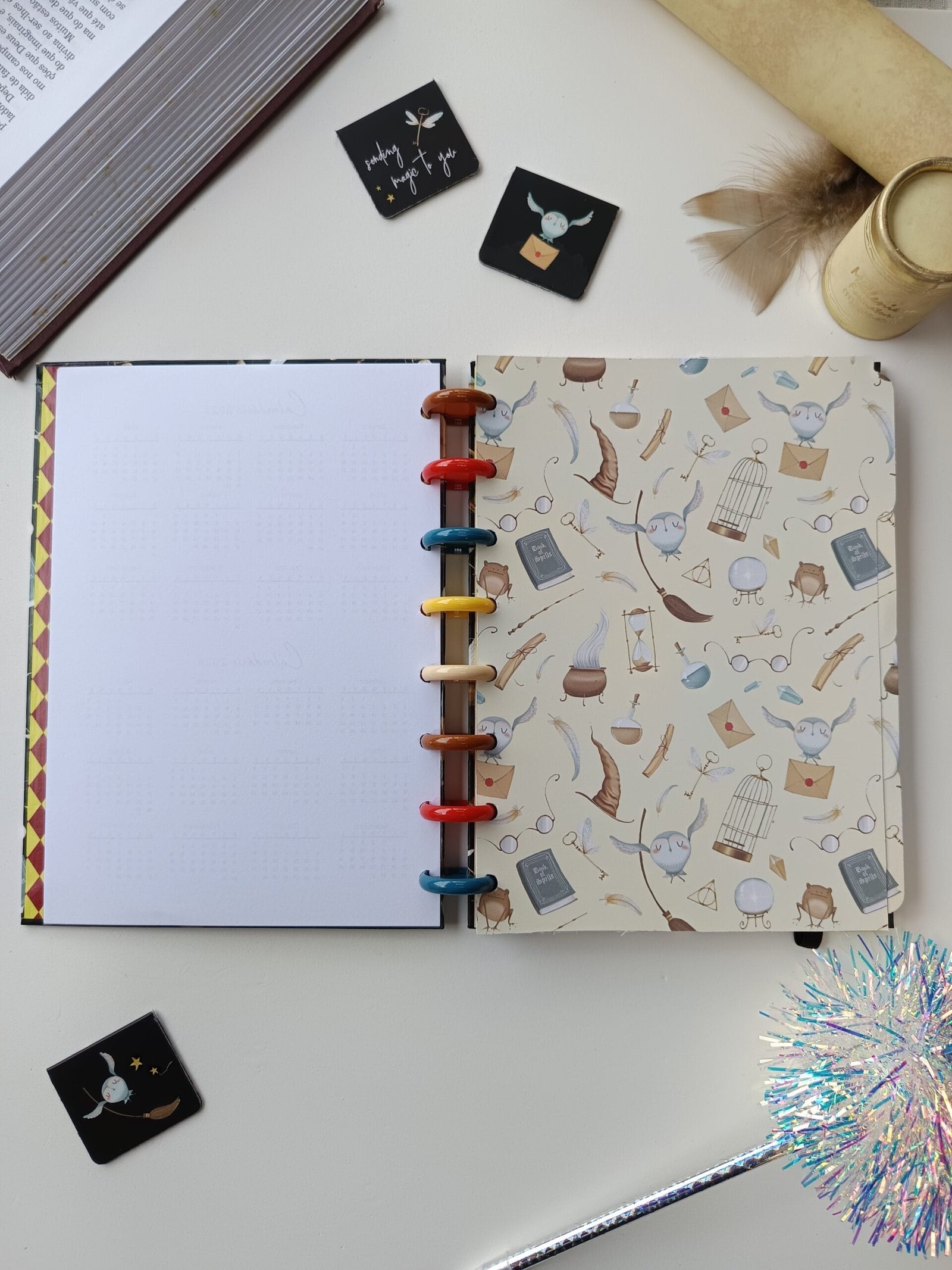 - Design místico: As capas e divisórias decoradas com símbolos mágicos, criaturas fantásticas e paisagens inspiradoras, que te transportam para um mundo de fantasia a cada página.
