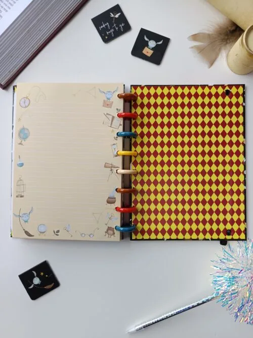 Com capa resistente e ilustrações mágicas, este caderno possui sistema de discos que facilita a remoção e adição de folhas. Compacto, leve e ideal para carregar suas anotações e inspirações para qualquer lugar!